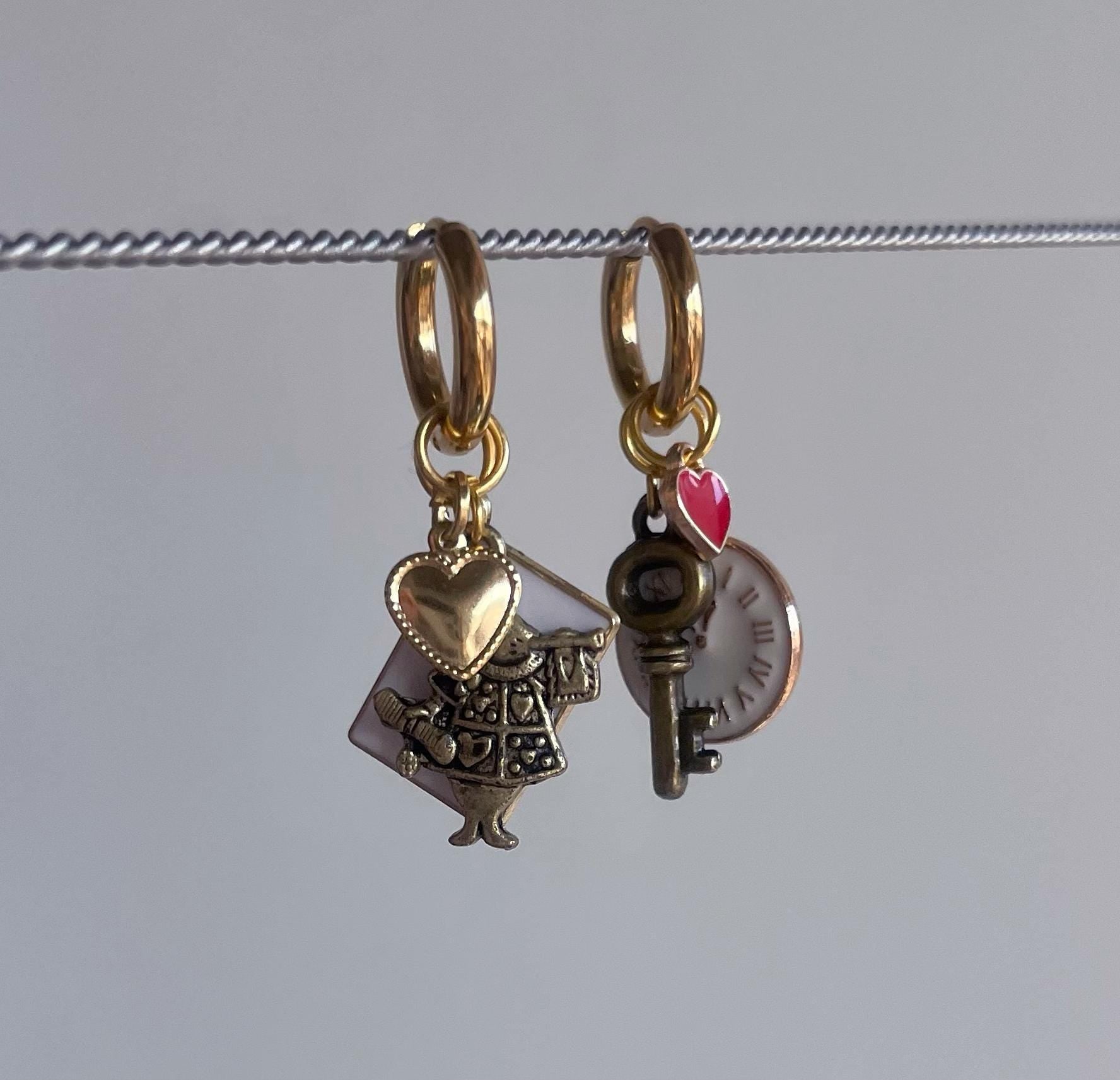 The earrings feature a 14mm huggie hoop made of real 18K gold-plated stainless steel for durability and a luxe feel. The design is accented with a variety of enchanting charms including: a bronze rabbit character, a bronze key, an enamel Ace of Hearts charm, a clock charm, and a stamped gold heart—each piece meticulously chosen to represent the whimsical elements of the beloved story.